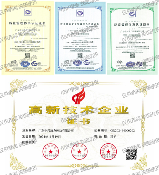 廣東中興液力傳動有限公司作為高新技術企業,始終堅持以質量求生存,以創新求發展。公司目前已獲得2023年質量管理體系認證證書、2024年職業健康安全管理體系認證證書、2024年環境管理體系認證證書及2024年高新技術企業證書,體現了公司在產品質量、管理水平和技術創新方面的綜合實力。